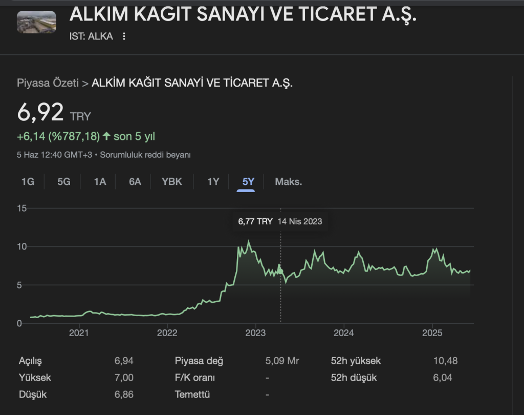 💵 Güncel Hisse Fiyatı (5 Haziran 2025): 6,92 TL