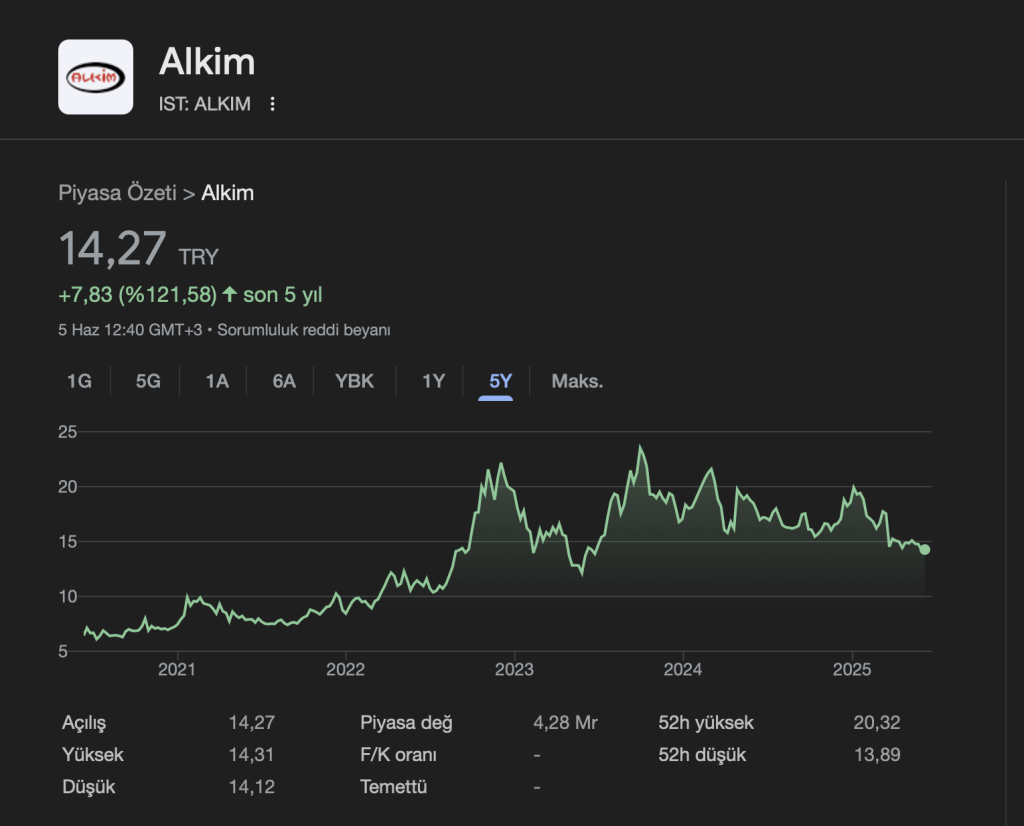 💵 Güncel Hisse Fiyatı (7 Haziran 2025): 14,27 TL