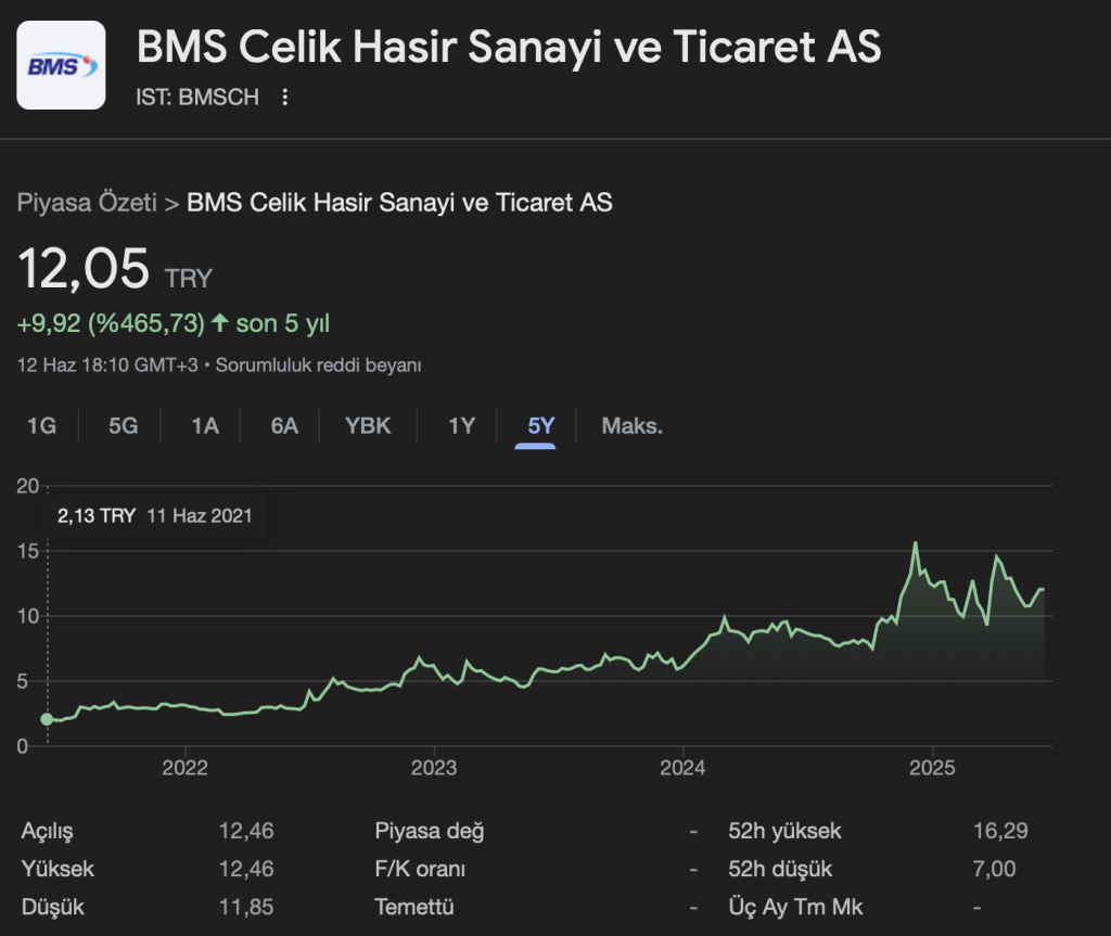 💵 Güncel Hisse Fiyatı (12 Haziran 2025): ~11,70 TL